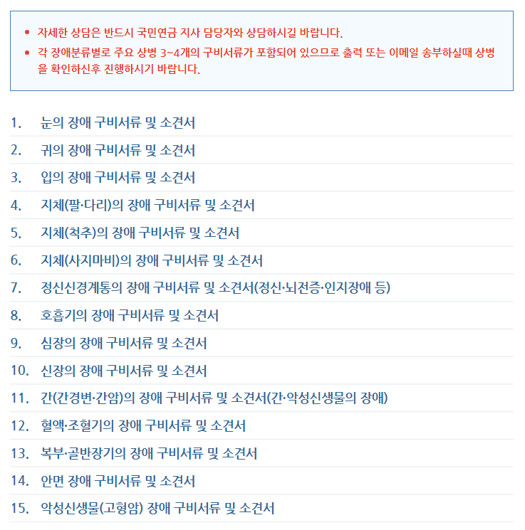 장애심사를 위한 장애분류별 구비서류