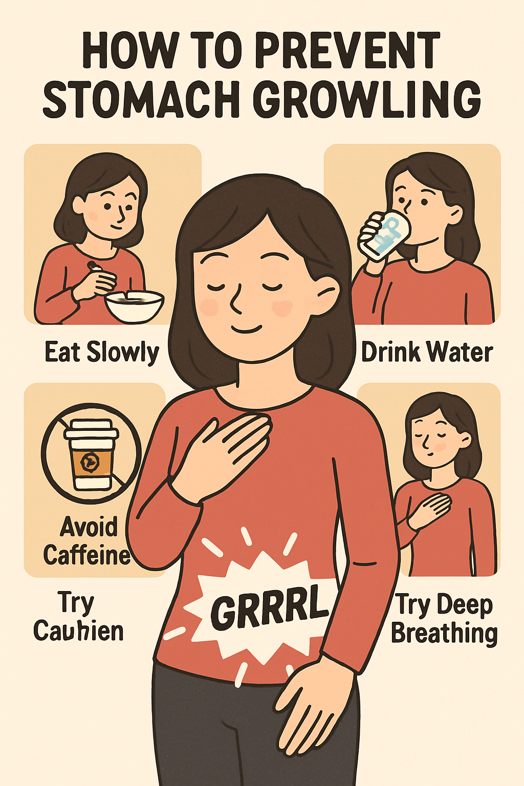 배를 부드럽게 마사지하면 위장 내 가스를 배출하는 데 도움이 되며, 복식호흡을 통해 공복 소음을 줄일 수 있습니다.