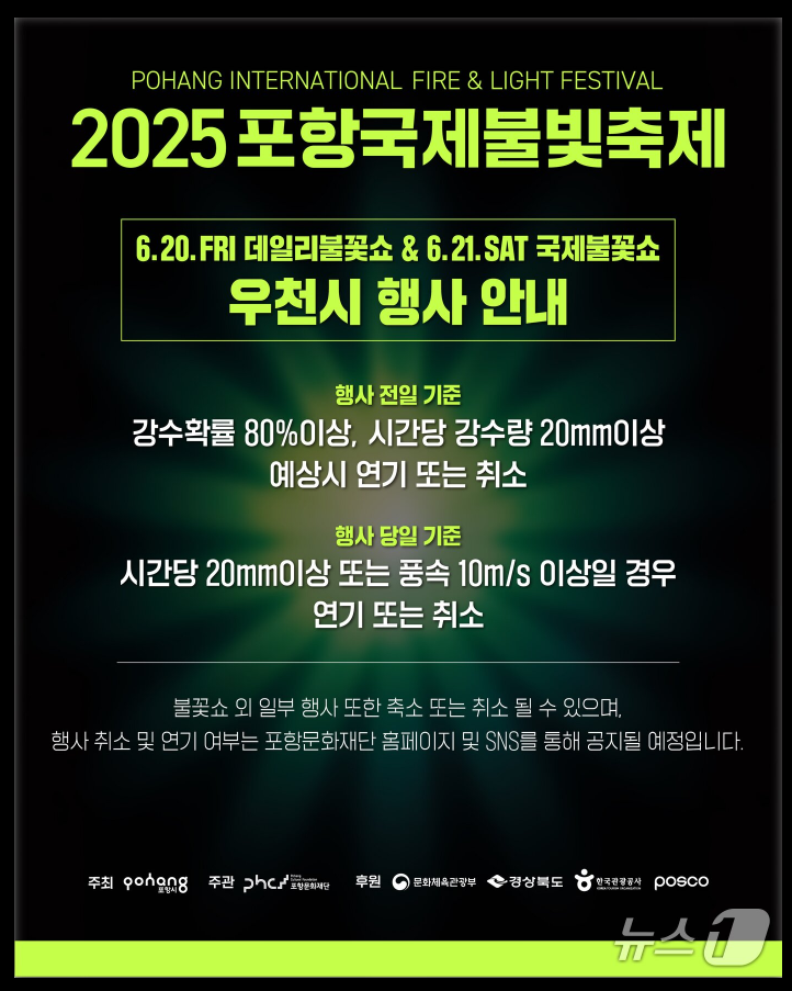 - 포항국제불빛축제 공식 홈페이지 : 공지사항 → ‘우천 시 안내’ 게시판 수시 업데이트
